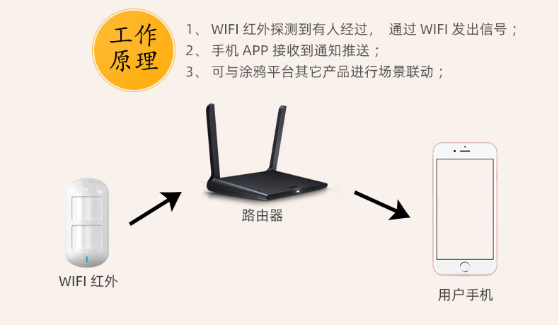 概述:wifi红外探测到人体经过,通过WIFI发送信号,手机APP接收到推送,可与涂鸦其他产品联动。